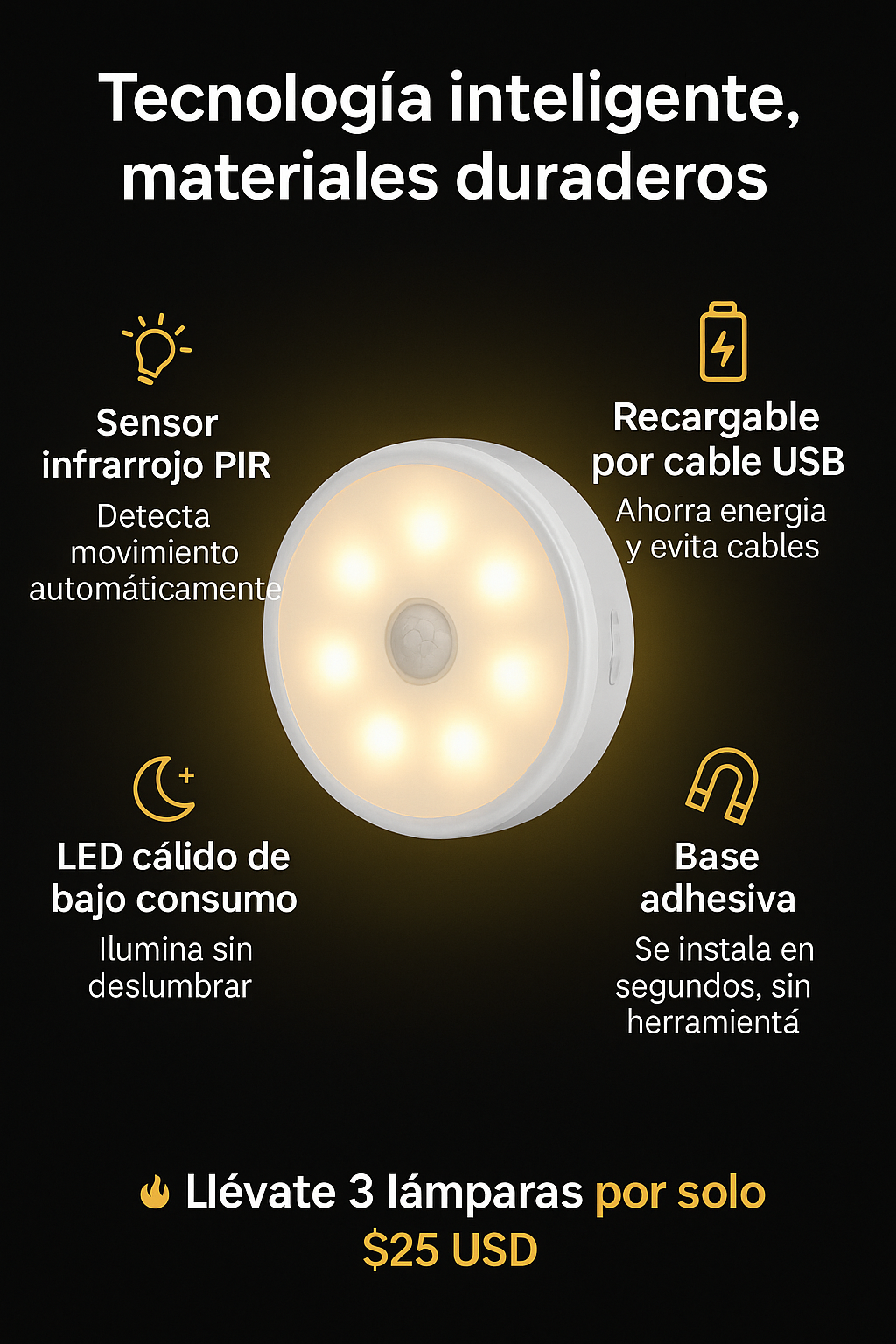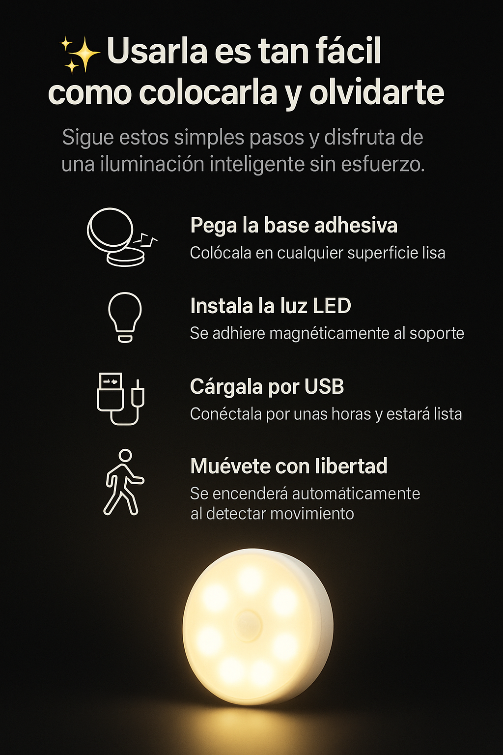 💡Encendido automático — Se activa al detectar movimiento.